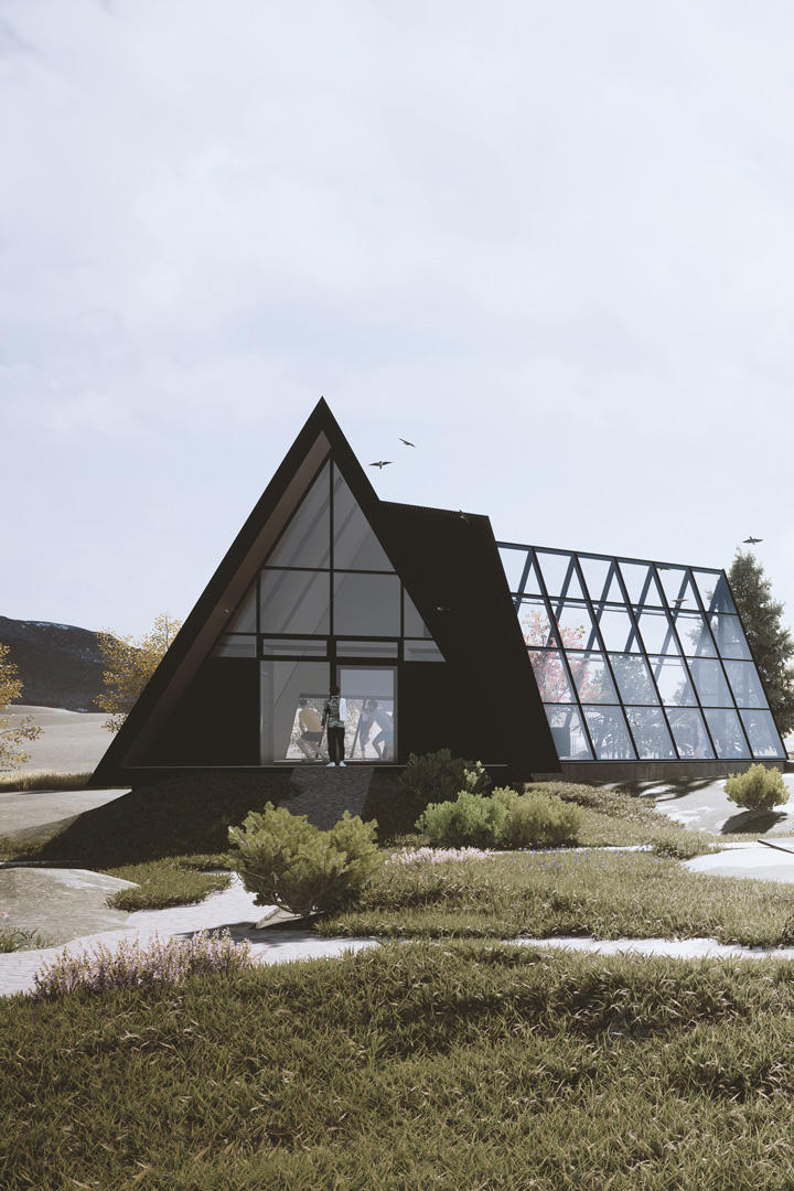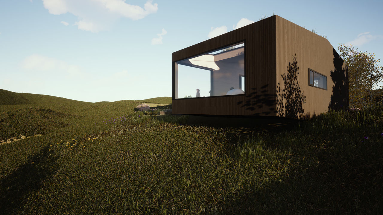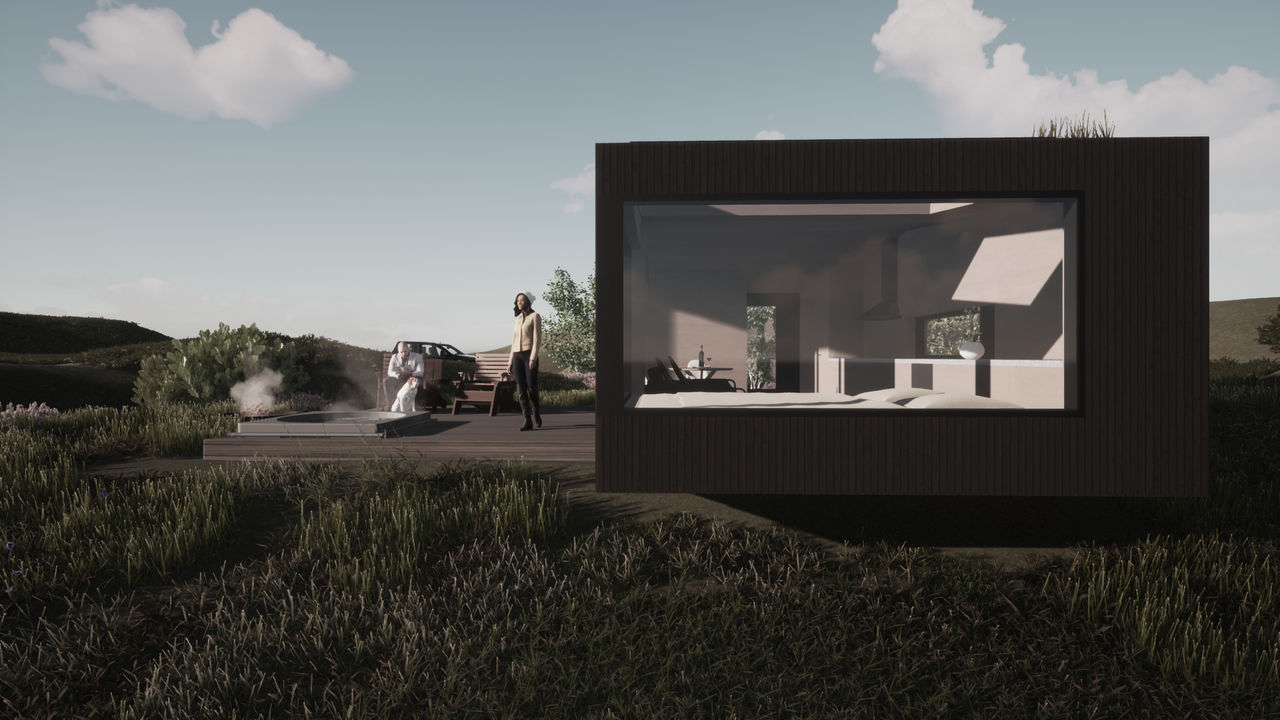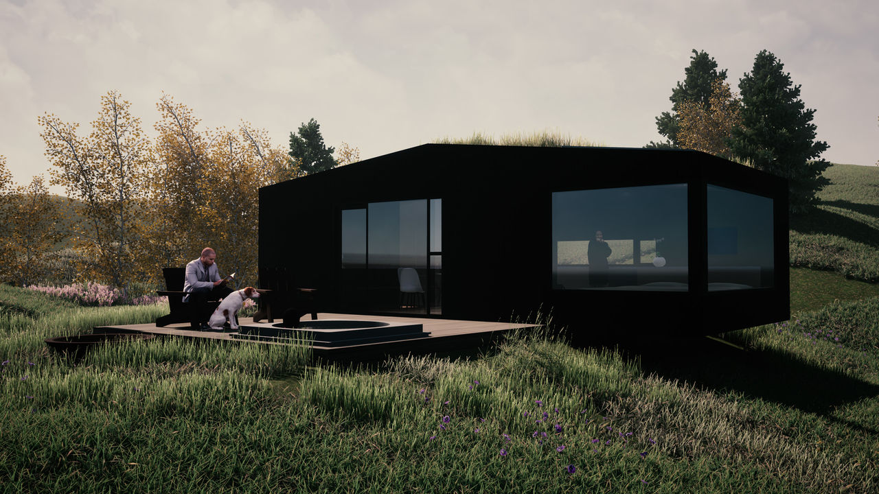 With focus on the connection to nature, the design features a large window blurring the boundaries between indoors and outdoors, making the cabin part of the landscape.