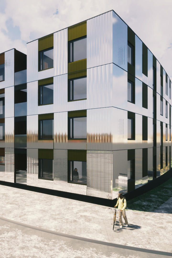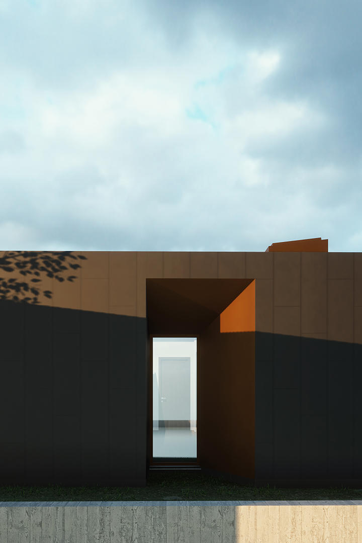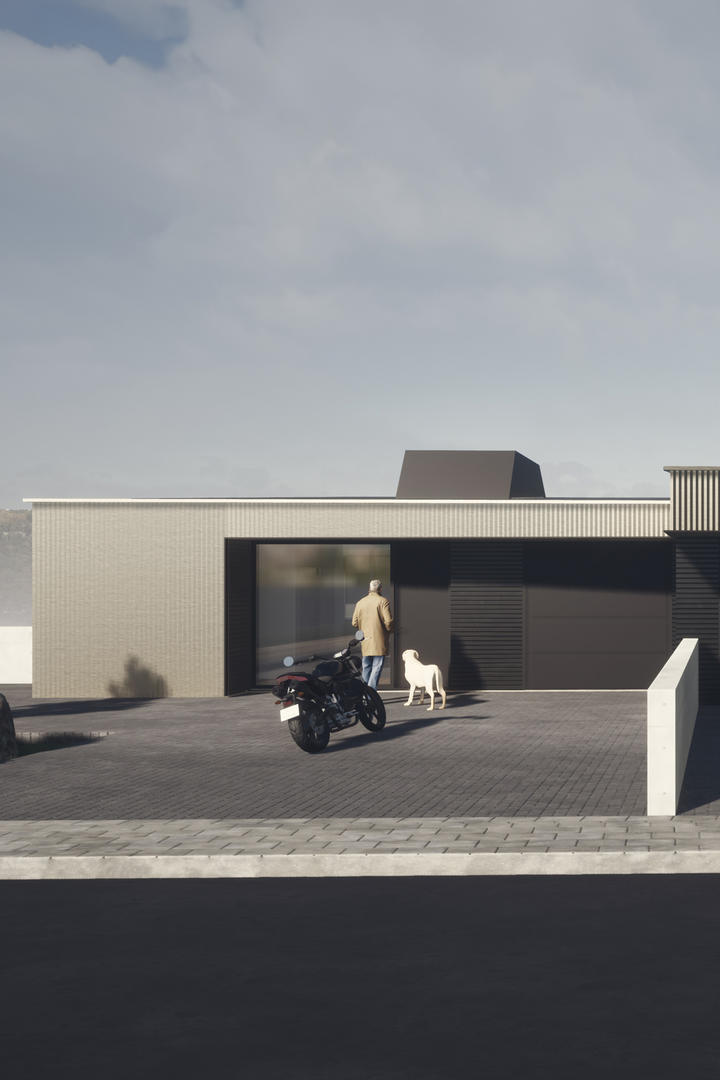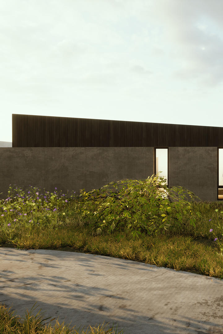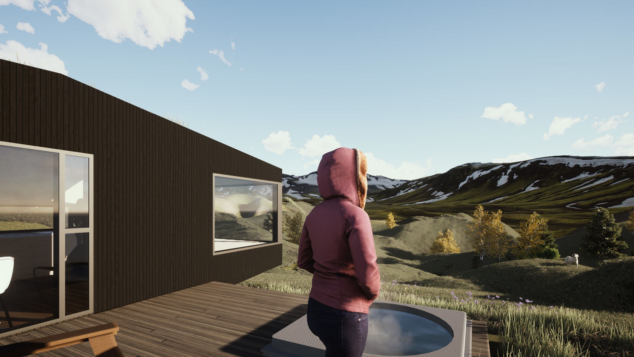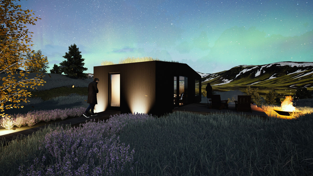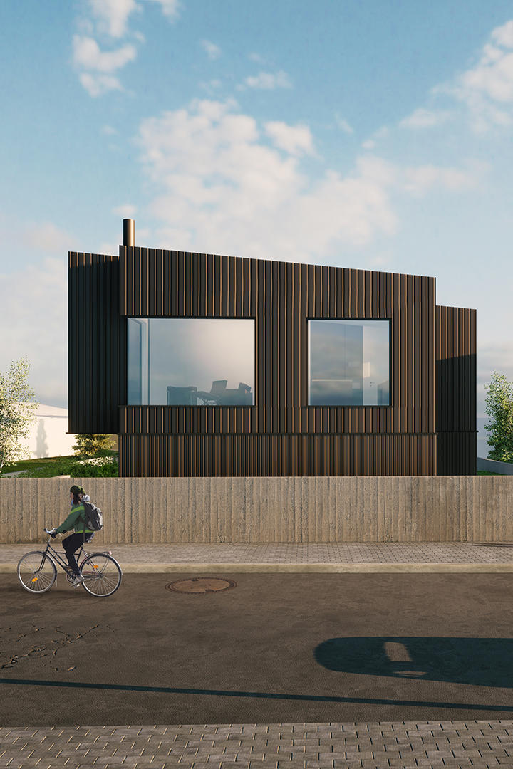 The prefabricated wooden structure is clad in Icelandic ash on the exterior. The surface is burnt to create a rather dark and maintenance free facade.